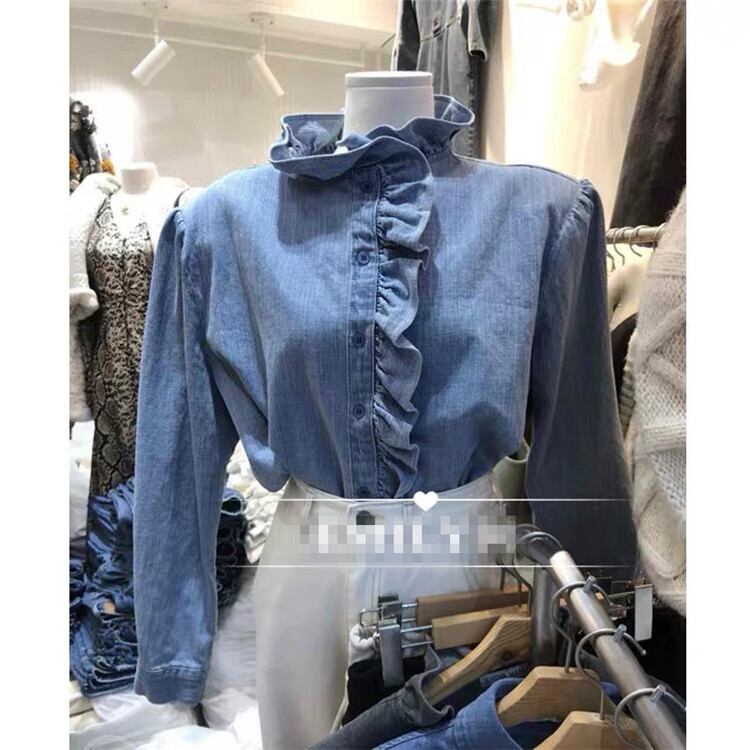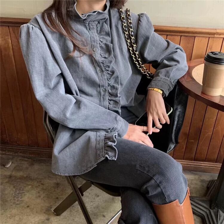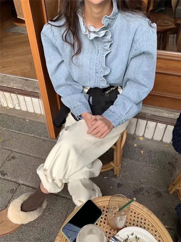 定番デニムシャツもフリルデザインお洒落なコーデに◎